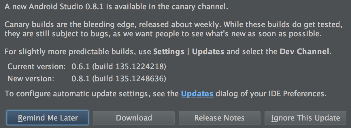とりあえず、AndroidStudioを立ち上げるとこのような事になっていて、通常ならこのグリーンの部分にアップデート用のリンクが出現しているはずなのだが、今回はメッセージのみ。